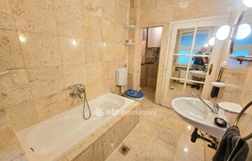 Az ablakos fürdőszoba egy nagy káddal van ellátva, innen nyílik a tehnikai helység/tároló ahova a kedvezményes tarifás távvezérelt villanyóra által ellátott elektromos vízmelegítő bojler van felszerelve. Mivel 2 külön villanyóra van így simán beleférünk a támogatott kedvezményes áram mennyiségbe. Mindkét helység a padlótól a mennyezetig szintén vastag márványlapokkal van burkolva.