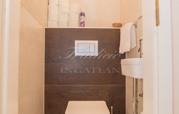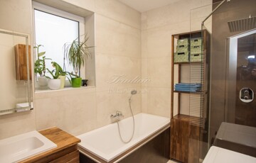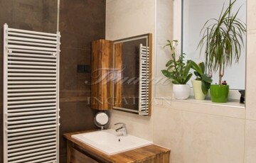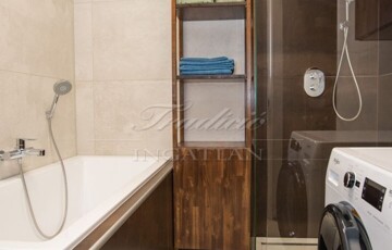• Fürdőszoba és külön WC: mennyezetig érő greslap burkolat, kád és zuhany, elektromos padlófűtés, kombinált radiátor (elektromos vagy gázcirkó), egyedi, fűthető tükör, integrált szagelszívás.