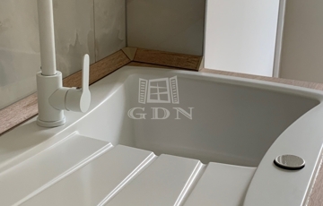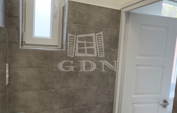 • Modern, harmonikus belső: fehér falak, tölgy színű vízálló laminált burkolat, bézs-zsálya árnyalatú fürdőszoba