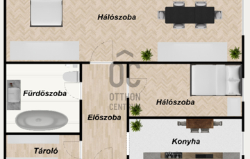 - előszoba, 2 különnyíló szoba, konyha, fürdőszoba-WC, kamra, valamint közös tároló is tartozik hozzá.