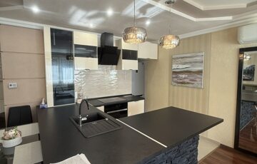 Tágas, napfényes nappali–étkező–konyha, gépesített, beépített mosogatógéppel felszerelt modern konyhabútorral.