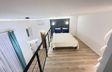A szoba végéből kényelmes lépcső vezet fel a légies megjelenésű galéria szintre, ahol a franciaágyon kívül méretes gardróbszekrény is helyet kapott.
