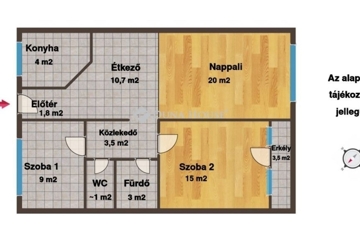 68 négyzetméteren kapott helyet 2 hálószoba, nappali, étkező, konyha, külön fürdőszoba és wc. Az elrendezés a mai kor követelményeinek megfelel, a lakótér és a vendégek fogadására kiválóan alkalmas nappali/étkező elkülönül egymástól.