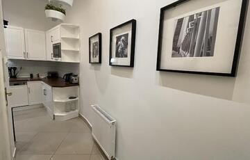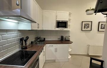 Közvetlen szomszédságában találjuk a teljeskörűen gépesített (sütö, főzőlap, elszívó, mosogatógép, hűtőszekrény, beépített mikro) konyhát.