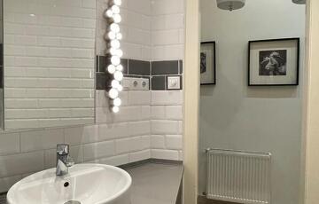 A lakásba lépve egy modern előszobába jutunk. Innen közelíthetjük meg az épített zuhannyal, mosdóval, törölközőszárítóval és mosógéppel szerelt fürdőszobát továbbá a kézmosóval is rendelkező, külön wc-t.