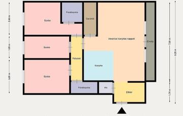 Elrendezése szerint 3 szoba, amerikai konyhás nappali, két fürdőszoba mellékhelyiséggel, külön wc és mosókonyhából áll.