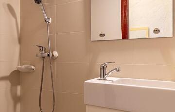 A fürdőszoba zuhanyzós, a konyha praktikus elrendezésű, étkezős mérető.