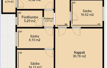 Az ingatlanban jelenleg egy tágas, 31 nm-es nappali található, amelyből a legnagyobb, 13 nm-es hálószoba nyílik. A további három hálószobát (10 nm, 11 nm, 12 nm) a közlekedőn keresztül érhetjük el. A mostani elrendezés igény szerint könnyen alakítható, ugyanis a lakás középső részén végig húzódó főfalon kívül, a többi fal mozgatható.