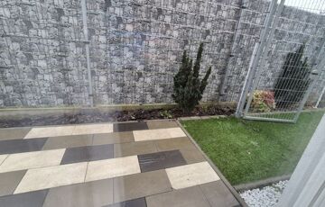35 m²-es térköves teraszt, gondozott, műfüves, parkosított, körbekerített udvart.