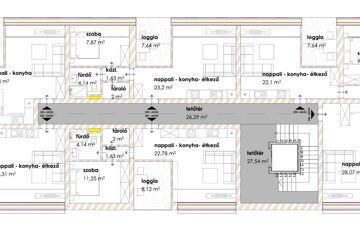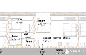A 1 db amerikai konyhás nappalival, 1db hálószobával, 1 db fürdőszobával, közlekedővel, loggiával rendelkezik.
