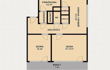 2 szoba, étkezős konyha, kamra, gardrób, zuhanyzós fürdőszoba, külön mellékhelyiség, közlekedő, előszoba, erkély.