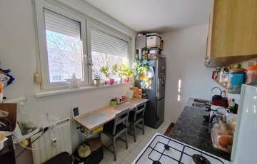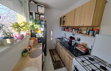 A konyha szép állapotú , keleti fekvése és nagy méretű műanyag nyílászárói által napfényes, a virágok jól érzik magukat ebben a lakrészben.
