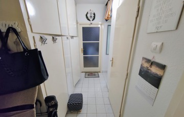 A közlekedőben beépített szekrények biztosítják a helyet a pakolásnak.