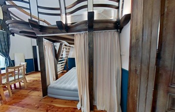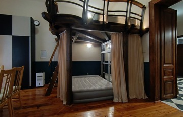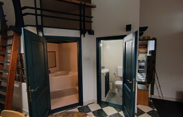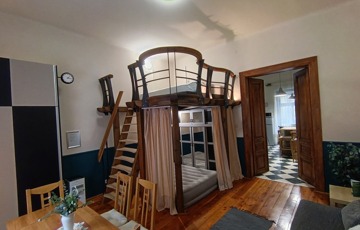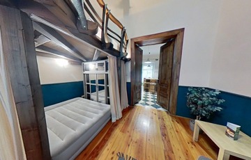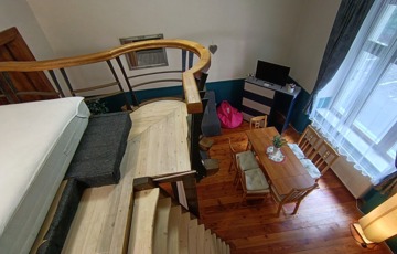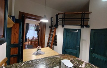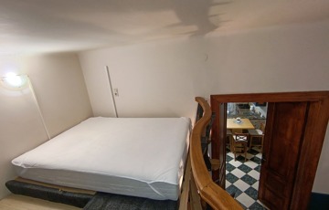 Két galéria is beépítésre került, a teljes szoba belmagasság 3.68 cm, a galériák 1. 6 m magasak,