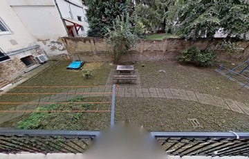 A lakás egy szépen karbantartott, belső udvaros társasház magasföldszintjén található. A belső udvar rendezett, főleg gyerekek számára értékes terület, homokozóval, hintákkal, zöld felületekkel.