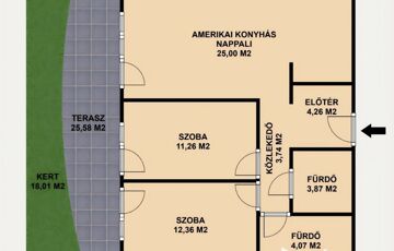 - Saját privát kertrész 43,59 m2, melyből: terasz: 25,58 m2 – tágas, ideális családi vacsorákhoz, kert: 18,01 m2.
