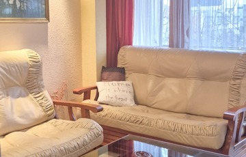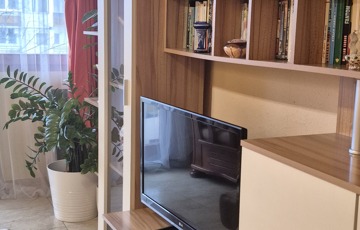 The apartment is for sale with the cherry wood, leather sofa, built-in wardrobe, wardrobe, kitchen furniture.