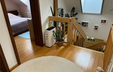 Alsó szint: Világos amerikai konyhás nappali, külön nyíló szoba, tágas fürdőszoba, külön WC és egy praktikus dolgozósarok.