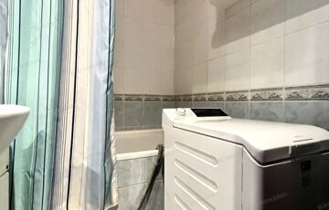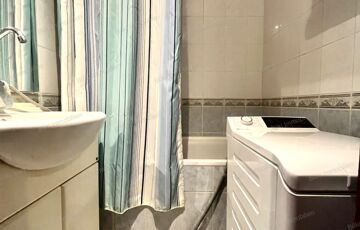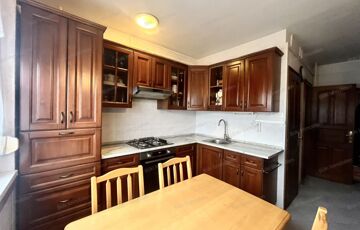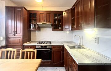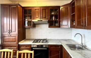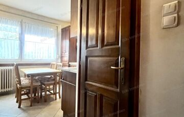 A konyha külön helyiségben található, jól átgondolt elrendezésű, kényelmesen használható. A masszív, fa konyhabútor beépített gépekkel felszerelt, a munkafelületek praktikusak, a burkolatok időtállóak. A fürdőszoba felújított, a vízvezetékek cseréje megtörtént, a WC külön helyiségben kapott helyet, ami a mindennapokban jelentős kényelmet ad, különösen több együtt élő személy esetén.