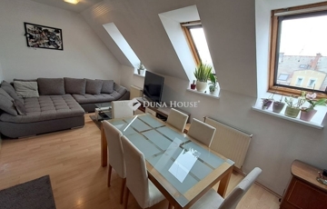 Eladó Pécs belvárosában a Móricz Zsigmond téren egy jó állapotú, 65 m2-es, belső kétszintes, gázcirkó fűtésű, két hálós tetőtéri téglalakás.