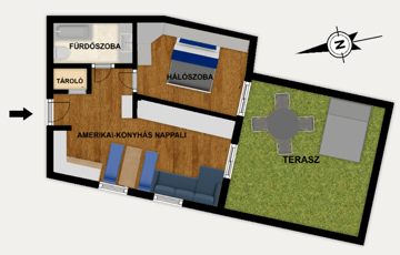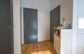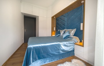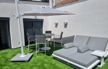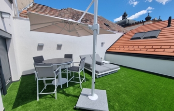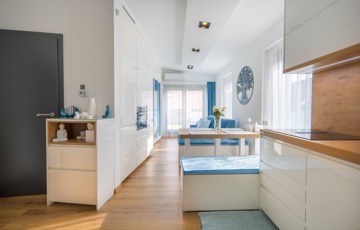 A 2 szobás ingatlan egy 30 m²-es saját terasszal, valamint fedett kocsibeállóval rendelkezik. A beépített, gépesített egyedi, magas minőpségű konyha NEFF gépekkel szerelt, a bútorok az ingatlan paramétereihez igazodva, egyedileg készültek, valamint a teraszbútorzat vadonatúj - mindezek az ár részét képezik.