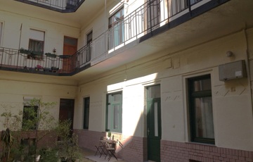 A lakás ablakai egy világos rendezett udvarra néznek.