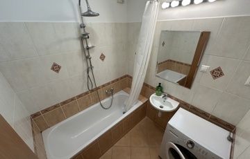 Gépesített konyha és fürdőszoba, kád, külön szobás WC, külön nyíló előszobával. A lakás új légkondicionálóval és redőnyökkel felszerelt, központi fűtéses és távhős melegvizes. A konyhában nagy méretű hűtő, elektromos sütő és légelszívó működik. A lakás félig bútorozott, L alakban fixen rendezett 4 nagyméretű kétajtós szekrénysor, ezen kívül van még egy mozgatható polc elem, egy fiókos szekrény és két bárszék.