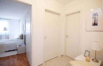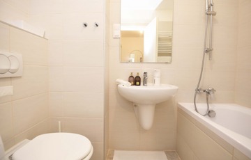 A 4,5 nm-es fürdőszoba kádas kialakítású, egy hosszú nap után kellemes kikapcsolódást nyújt egy nyugodt fürdő, miközben a világos, letisztult tér barátságos és kényelmes hangulatot teremt.