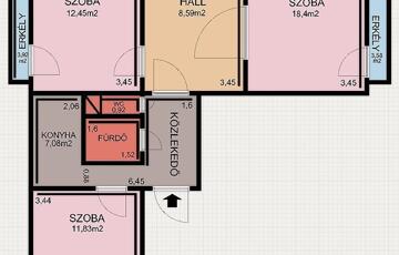 Alapterület: 70 nm, 2+1 szoba+hall