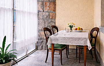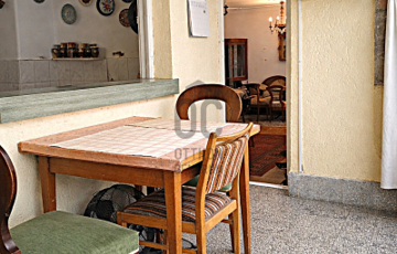 A terek arányosak, átgondoltak, finoman őrzik egy igényes, kulturált múlt lenyomatát. A konyha és az üvegezett veranda közötti nagy tálalóablak különleges kapcsolatot teremt: a veranda egész évben használható, természetközeli étkezőként működik, közvetlen kertkapcsolattal.