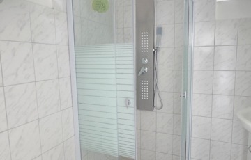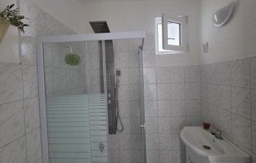 A fürdőszoba külön említést érdemel: ízlésesen kialakított, modern megoldásokkal felszerelt, ahol a minőségi burkolatok, a harmonikus színvilág és a praktikus elrendezés együttesen teremtenek elegáns, mégis otthonos hangulatot.