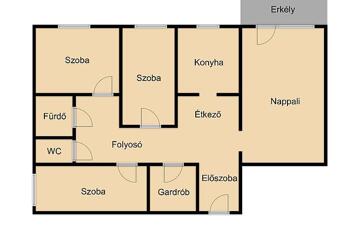 Elosztása nappaliból és 3 félszobából, gardróbból, konyhából és külön sarokkádas fürdőből és mosdóból áll. A konyhában és a fürdőben is új bútor kapott helyet.