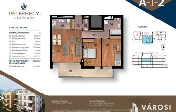 A hirdetésben szereplő lakás az A épület első emeletén található, amerikai konyhás nappali +2 hálószobás elrendezésű.