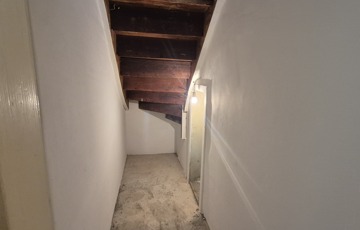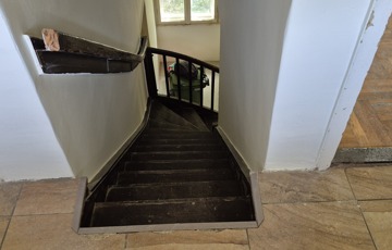 Árad a fény, hatalmas belmagasság a robosztus, stabil, kézi munkával készített fa lépcső feljáró.